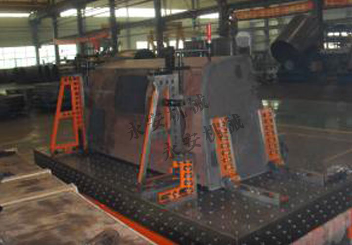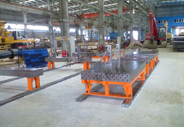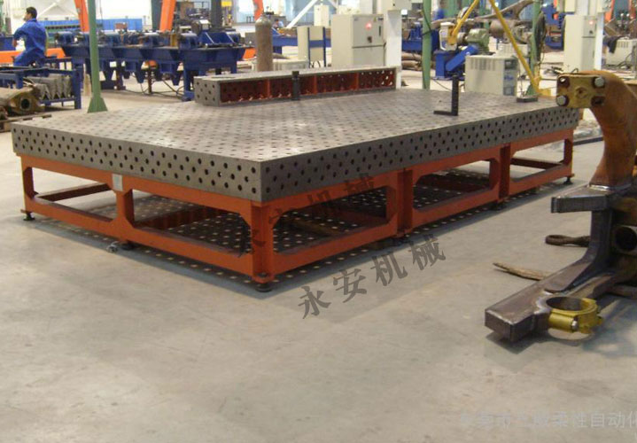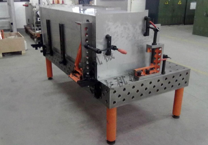 焊接組合夾具也稱為柔性組合夾具,三維柔性組合工裝夾具,采用標準化技術要求制作的標準化、系列化、通用化的許多模塊組成,所有模塊的鏈接、固定和壓緊都是以孔定位用鎖緊銷來實現快速鎖緊,模塊與模塊之間可以根據工件的實際尺寸而調整,整個一套工裝夾具系統的組合可以實現二維和三維空間的搭建,像小孩子玩積木一樣簡單、容易、快捷。為了適應不同外形尺寸的工件,柔性組合夾具系統在焊接生產中分為28系列和16系列.每個系列的元件按照用途可分為8類。 ① 基礎件:如方形、矩形、圓形基礎板等,用作夾具工裝臺. 工作臺的五個工作面都有100mm×100mm(D28系列)或50mm×50mm(D16系列)的帶有網格標注的孔。其五個面的平面、平行、垂直公差精度以及孔與孔的位置精度都是非常高的,保證在臺面上的定位和臺面與其它模塊之間的組合都具有足夠的使用精度要求。基礎臺面的尺寸從1000mm×1000mm到4000mm×2000mm可以任意選擇,特殊尺寸可以訂做。如果臺面與臺面組合后的精度要求很高,則可以使用導軌將它們連接起來。 ② 支承件:包括U型方箱、L型方箱、支承角鐵、角型連接塊、角度器、框式支撐座等;用于高度定位或平臺拓展及其它附件的定位或壓緊,是為了保證工件在加工過程中達到一定高度要求,而將支撐件定位在平臺上的元件如墊片、墊板、支承板、支承塊和伸長板等,主要用作不同高度的支承。 ③ 定位件:包括定位角尺、定位平尺、平面角尺、V型定位件、異心圓停擋,用于準確調整定位位置或高度,是為了保證工件在加工過程中達到一定尺寸精度要求,而將工件定位的元件;用于確定元件與元件、元件與工件之間的相對位置。 ④ 調整件:包括:調高器 調整墊片;用途:是用于元件與工件之間的位差間隙調整的元件。 ⑤ 壓緊件:包括:90°螺旋壓緊器、水平螺旋壓緊器、45°螺旋壓緊器、垂直壓式快速夾具、水平推式快速夾具;用途:是為了保證工件在加工過程中不被位移,而將工件壓緊在平臺或基礎元件上的元件。 ⑥ 鎖緊件:包括:快速鎖緊銷、沉頭快速鎖緊銷、沉頭鎖緊銷 、手柄快速鎖緊銷、定位銷、連接鎖磁性銷、內六角鎖緊銷、外六角鎖緊銷、磁性銷;用途:是為了保證元件與元件之間的定位鎖緊用的元件。 ⑦ 合 件:包括:90度夾緊轉角套 、45度夾緊轉角套 、平行夾緊轉角套 、垂直夾緊轉角套、標準型支撐腿、帶剎萬向輪型支撐腿 、可固定型支撐腿 、框架結構型支撐座、液壓升降型支撐座、支撐軌道;用途:是作用于元件與其他件之間連接或支撐作用的元件。 ⑧ 其他件:包括:止動環、接地器、螺旋夾緊 、夾管、起吊環、十字槽壓墊、兩點夾緊橋、三點夾緊橋、多用途支撐模板、平臺防護板、工具推車;用途:是作用于工裝元件組裝的配套附屬元件。 ⑨ 組裝工具:包括內六角扳手、油石、磁力鉗等裝配工具。